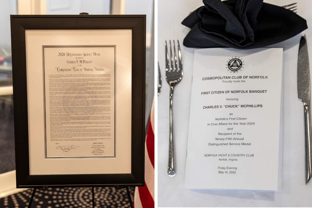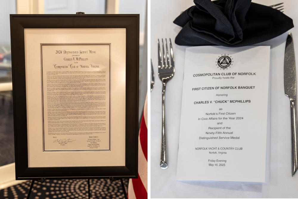 In 2024 the Norfolk Cosmopolitan Club selected Mr Charles V “Chuck” McPhillips as Norfolk’s First Citizen. Mr McPhillips is a Norfolk native who has demonstrated a love for this community by selflessly sharing his time, skills and leadership to improve the quality of life in Hampton Roads, most notably in the areas of education, positive youth development, and economic and cultural opportunities for people from all walks of life. The Norfolk Cosmopolitan Club proudly celebrated Norfolk First Citizen – Mr Charles V “Chuck” McPhillips on Friday Evening, May 16th at the Norfolk Yacht and Country Club.